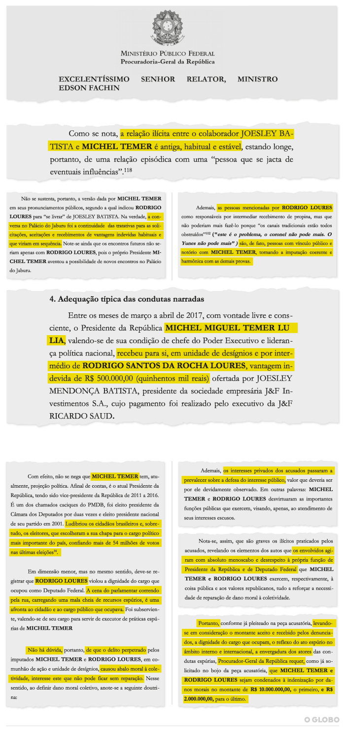 Janot afirmou que o presidente “ludibriou os cidadãos brasileiros”, e pediu que Temer pague indenização de R$ 10 milhões. Para o ex-assessor, que está preso desde o último dia 3, o valor pedido é de R$ 2 milhões. Rocha Loures foi flagrado recebendo de um diretor da JBS uma mala com R$ 500 mil. O Supremo Tribunal Federal (STF) investiga Temer por corrupção passiva, organização criminosa e obstrução de Justiça.