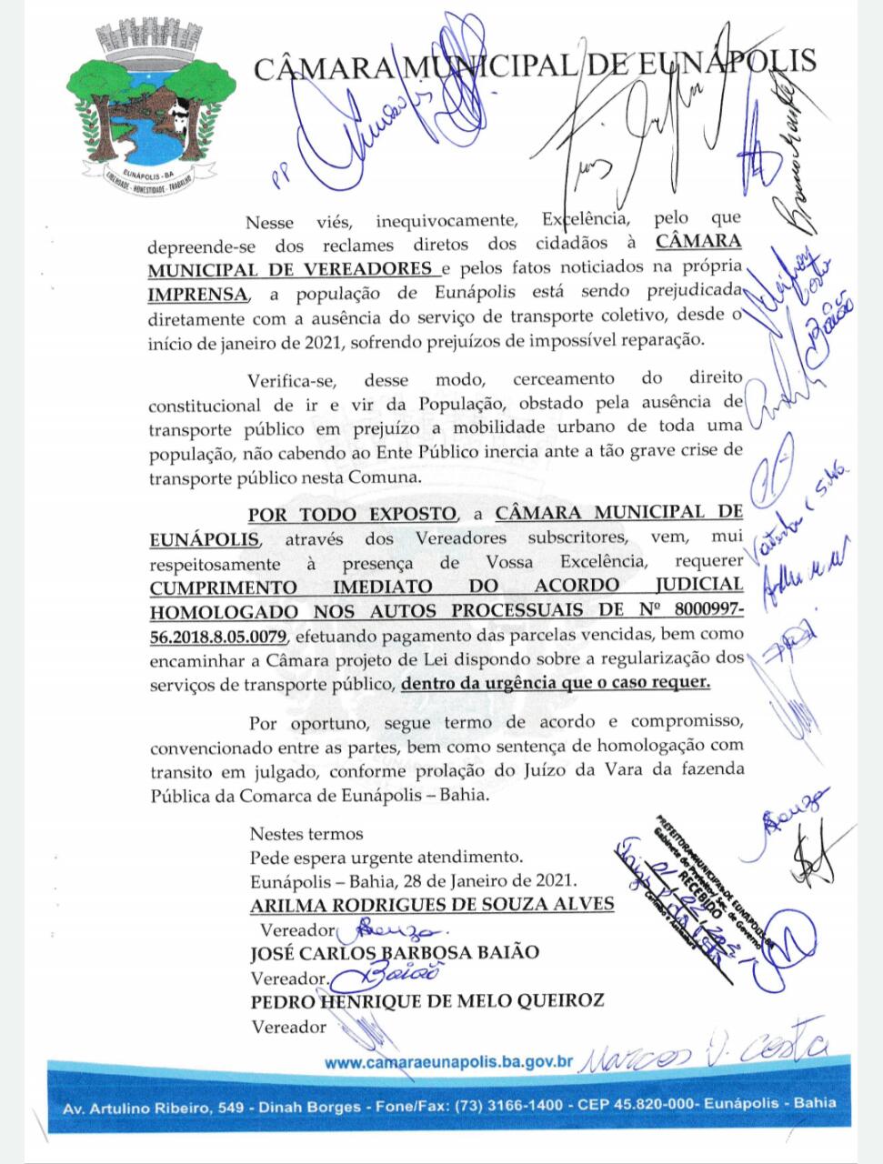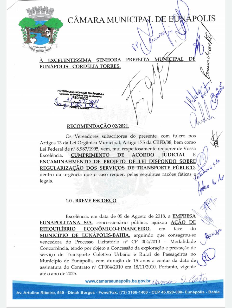 Veja o que foi recomendado pelo GRUPO DOS 11 e seguido pelos outros 6 vereadores que não teria participado da primeira reunião mas após tomar conhecimento da pauta se juntos os 17 vereadores recomendaram a prefeita que “CUMPRA DE IMEDIATO O ACORDO JUDICIAL HOMOLOGADO NOS AUTOS PROCESSUAIS DE Nº 8000997-56.2018.8.05.0079, efetuando pagamento das parcelas vencidas, bem como encaminhar a Câmara projeto de Lei dispondo sobre a regularizaram dos serviços de transporte público, dentro da urgência que o caso requer“.
