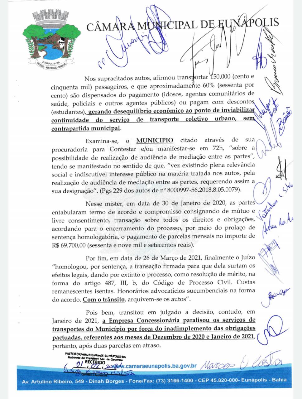 Após a reunião que teve a participação das Polícias Militar e Civil, o proprietário informou aos vereadores que o que impedia o retorno do serviço, não era falta de segurança e sim o não cumprimento de acordo judicial do município de Eunápolis e a GWG, acordo esse que o munícipio já estava devendo o mês de dezembro e janeiro e com isso não estava sendo possível arcar com as despesas com pessoal e manutenção da frota.