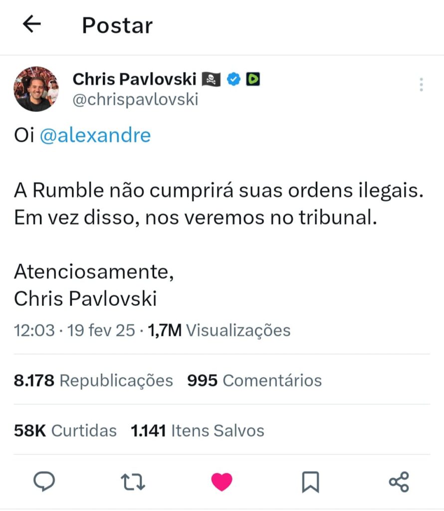 Nesta quarta-feira, (19. fev.2025) Cris Pavlovski, CEO da rede social Rumble, marcou o ministro Alexandre de Moraes no X, antigo Twitter, afirmando que: “A Rumble não cumprirá sua ordens ilegais. Em vez disso, nos veremos no tribunal.”