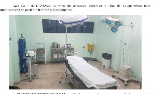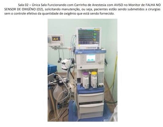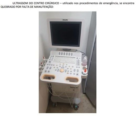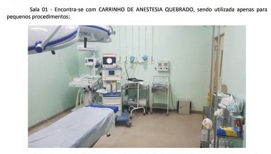 A título de exemplo, o denunciante relata que, apesar de possuir três salas de cirurgia com um aparelho de anestesia geral para cada uma delas, somente uma sala encontra-se apta para atender à população local e cidades vizinhas, uma vez que dois aparelhos instalados no setor estão quebrados e sem manutenção desde janeiro de 2019.