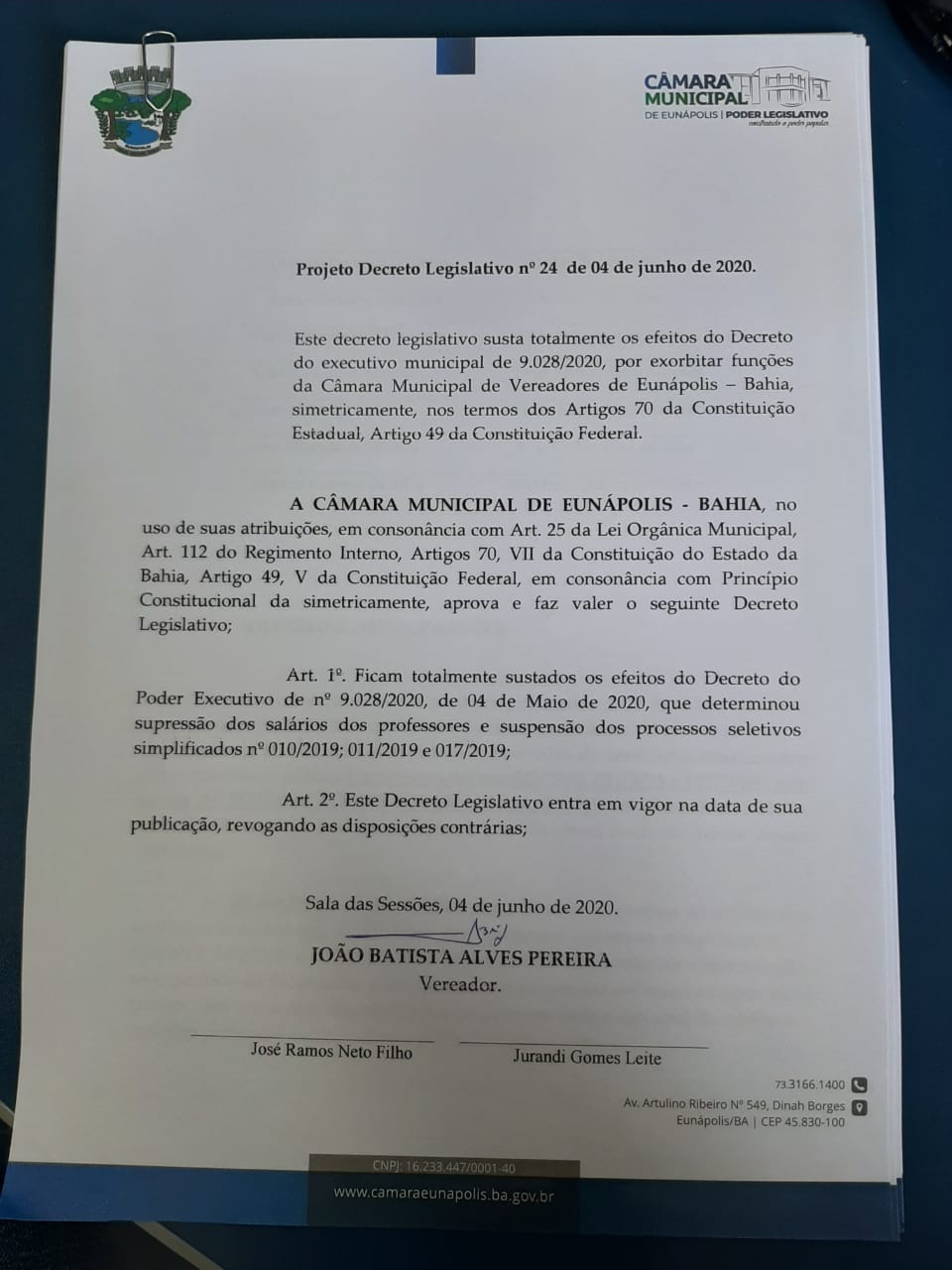 Vereador Jota Batista protocolou na manhã desta quarta-feira, 03 de Junho, junta à mesa Diretora da Câmara de vereadores a solicitação de desmembramento dos Decretos de Nº 9.028/2020 e o Decreto de Nº 9.011/2020, o primeiro é referente ao DECRETO DA MORTE, que tirou direitos de professores e demitiram dezenas de outros professores contratados.