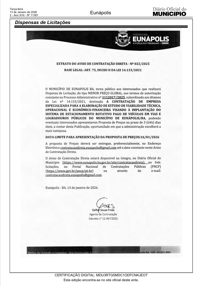 De acordo com o documento, eventuais interessados podem apresentar proposta de preços no prazo de três dias úteis a partir da publicação, com data-limite em 16/01/2026, preferencialmente pelo e-mail informado no aviso; o edital completo também estará disponível no Diário Oficial do Município, no portal de contratação direta e no PNCP. O aviso é assinado pelo agente de contratação Geft Souza Froes.